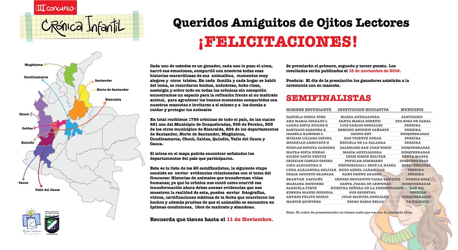 1.756 crónicas de todo el país participaron del tercer concurso de crónica infantil “Ojitos Lectores”, que promocionó la Institución Educativa Juan Manuel González y tuvo como tema principal este año “Historias de animales que transforman vidas humanas”.